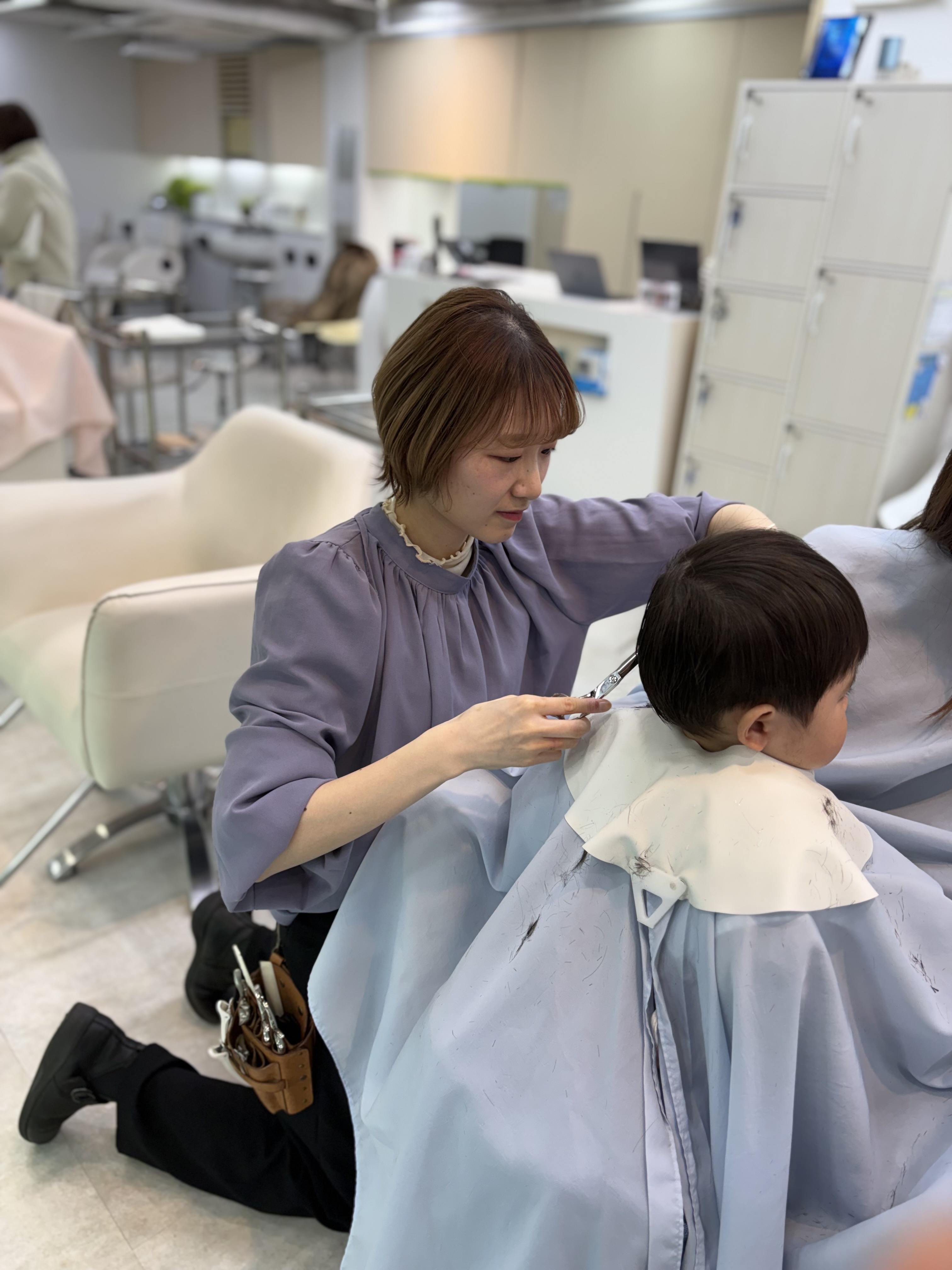 お子様が安心してカットができるように抱っこした状態でカットします✨